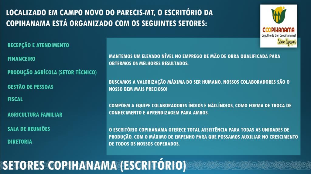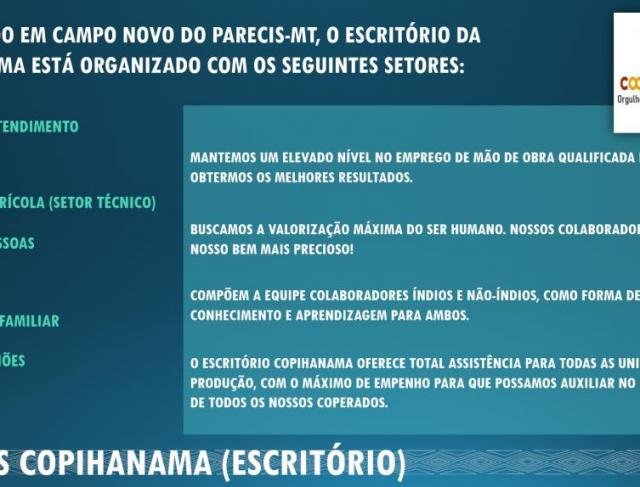 Frente aos desafios que enfrentávamos, decidimos, no ano de 2018, no município de Campo Novo do Parecis - MT, convocar uma Assembléia Geral com a finalidade de constituição de uma sociedade cooperativa de produção agropecuária. Deste evento nasceu a Copihanama, Cooperativa Agropecuária dos Povos Indígenas.